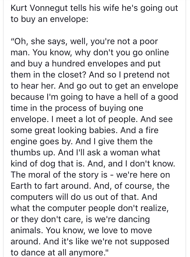 I was checking the weather (cold) and email (ads) when I popped over to Facebook and saw the story about Kurt Vonnegut buying an envelope that a friend had posted. I love this story so much and wanted to share it (and a few other quotes I found while spiraling down the rabbit hole that is the Internet.)