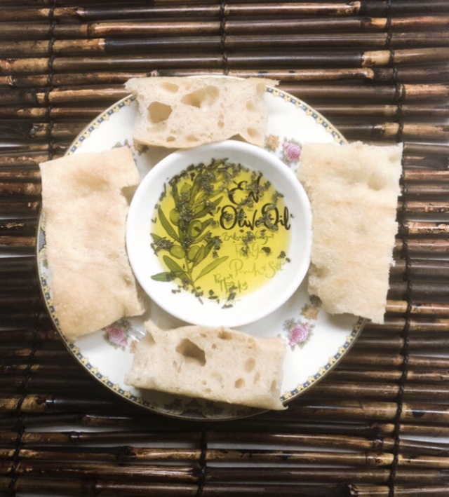But…..tonight there was a pan of fresh baked focaccia bread from our favorite local bakery, The Village Oven, (ordered special and picked up from the drive through window.) There was olive oil for dipping, and wine for sipping. The lights were soft, the rain loud.
