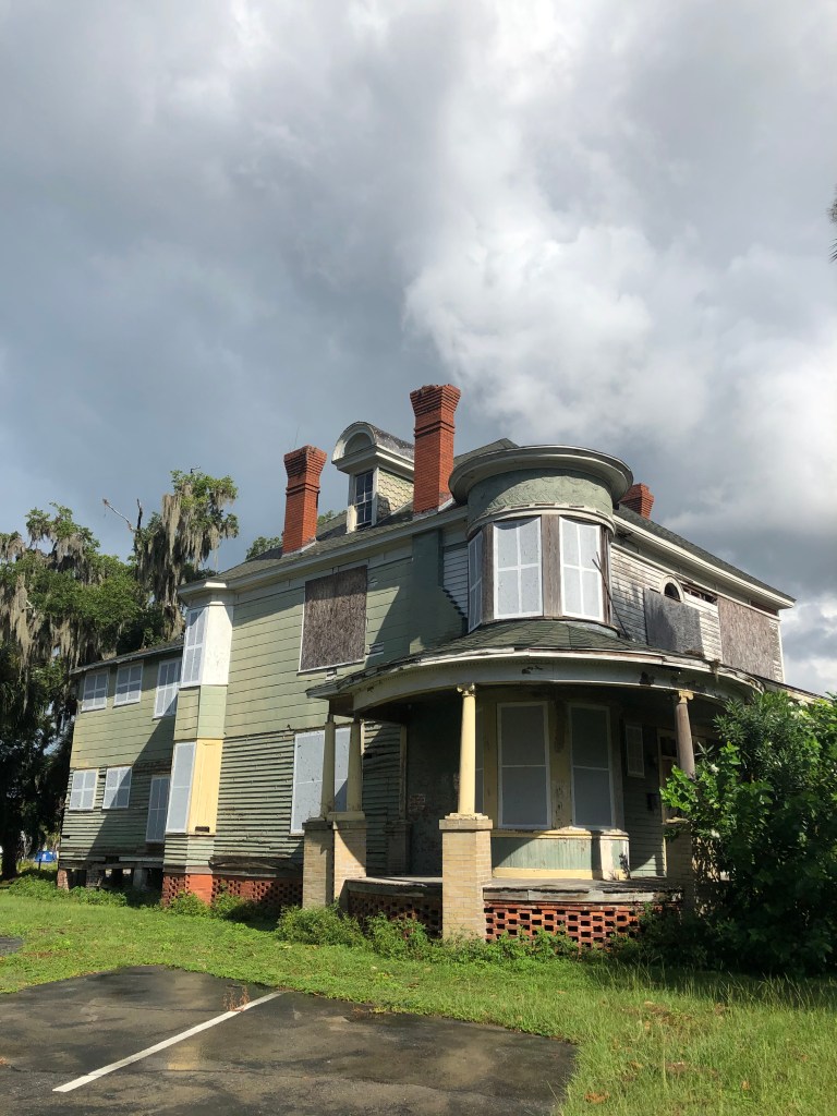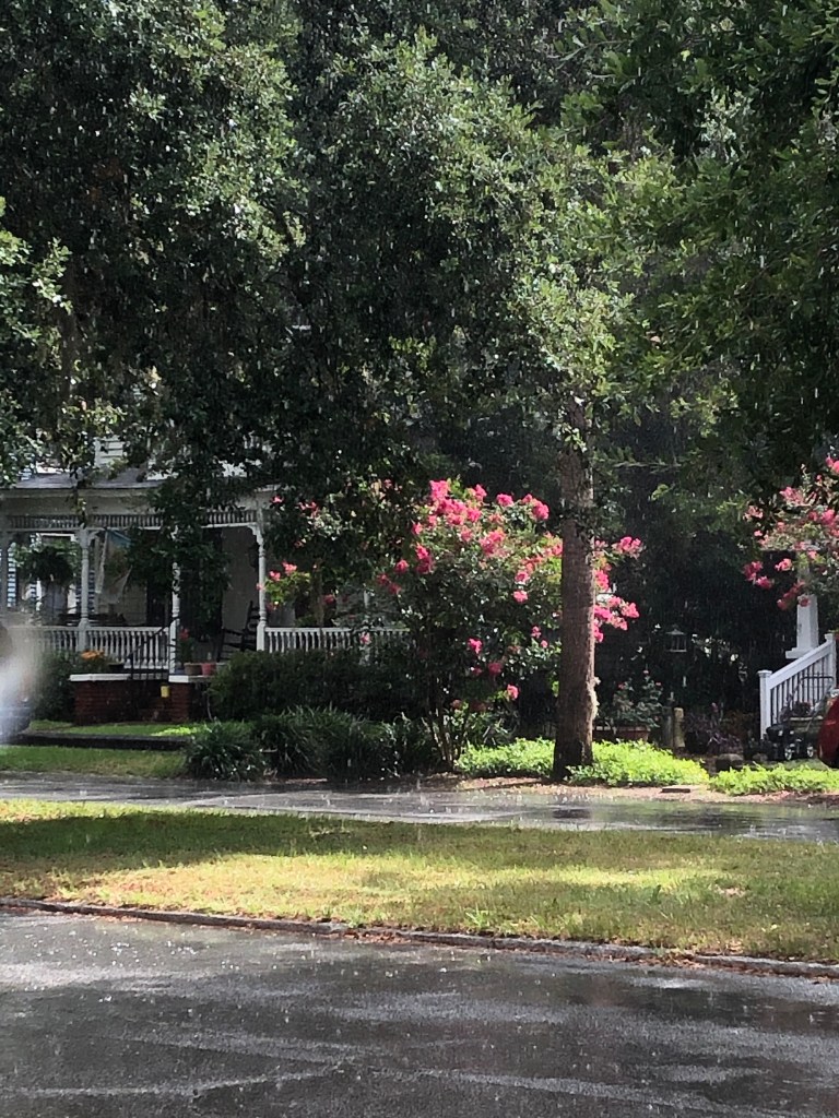 We scrambled across the street, sought shelter under the awning of the Presbyterian church.