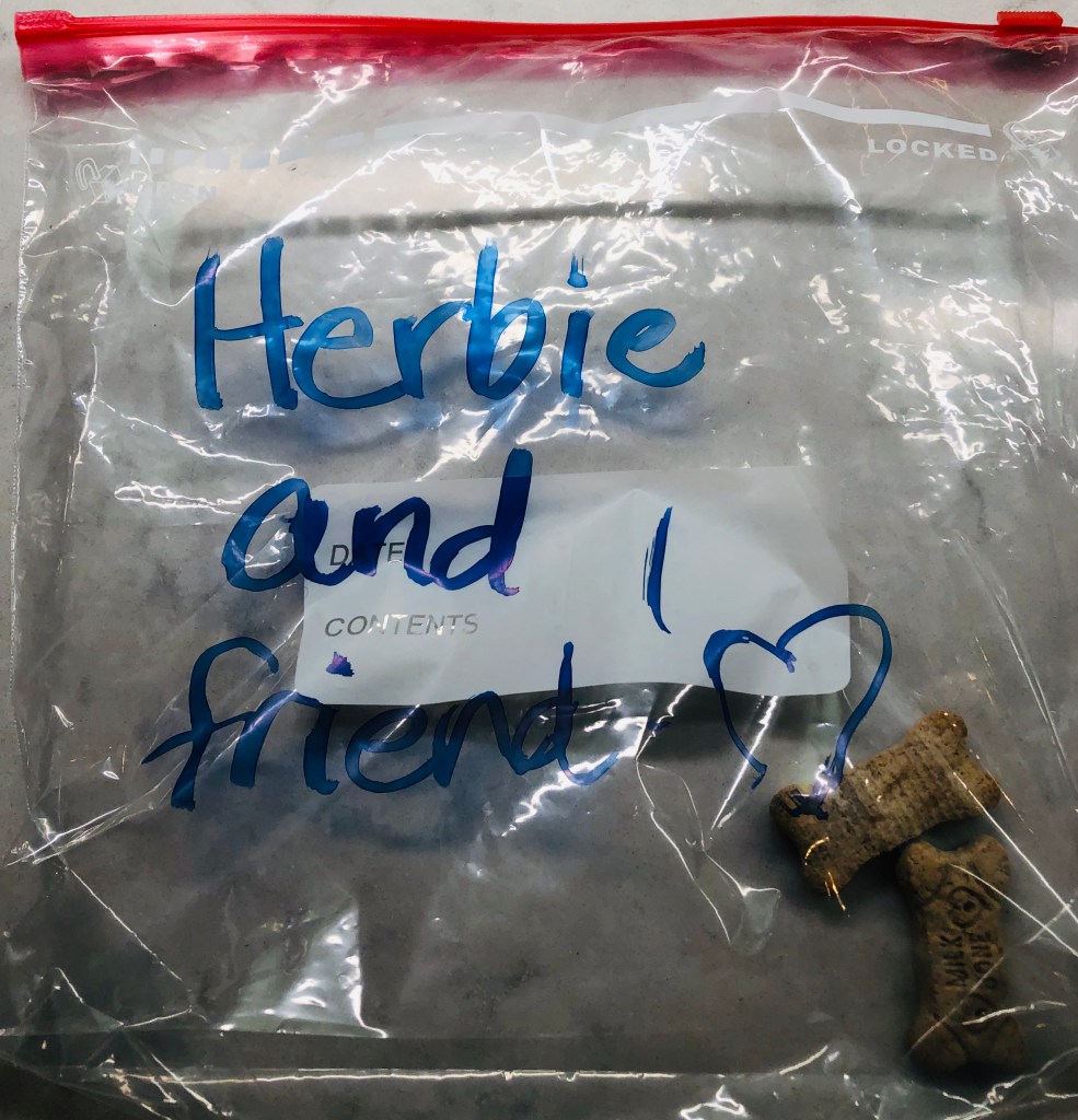 Opening the front door this afternoon to check the mail, I saw a ziplock bag laying on the welcome mat. Two milk bones lay inside, addressed to “Herbie and Friend.”