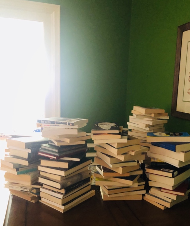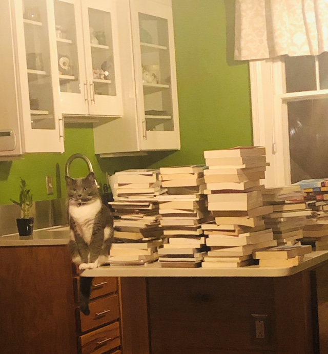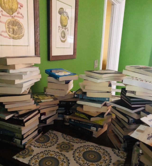 My husband peeks in at me over the top of the tower as we attempt to have breakfast together. I resist the urge to pile up more books and and become a municipality of one.