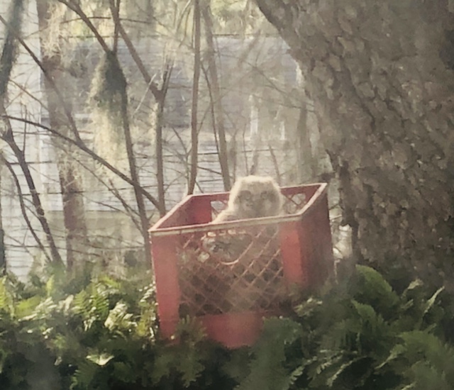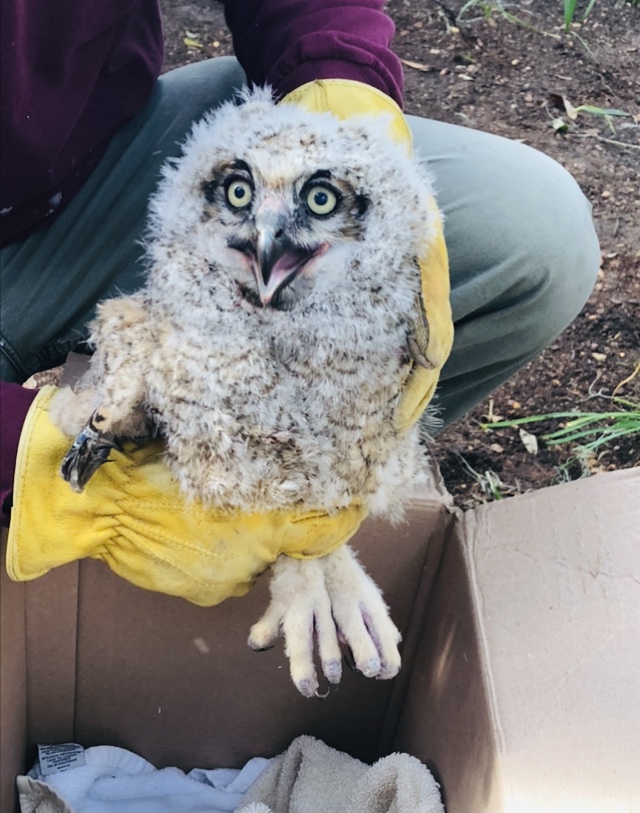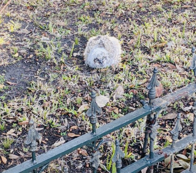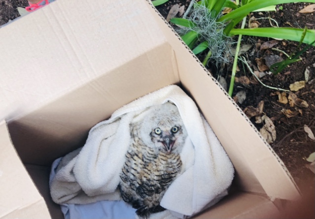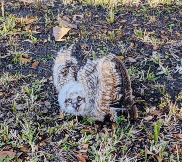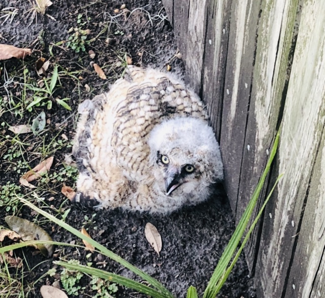 A great horned owl; not still a chick, not yet a fledgling, out of the nest and out of its element.