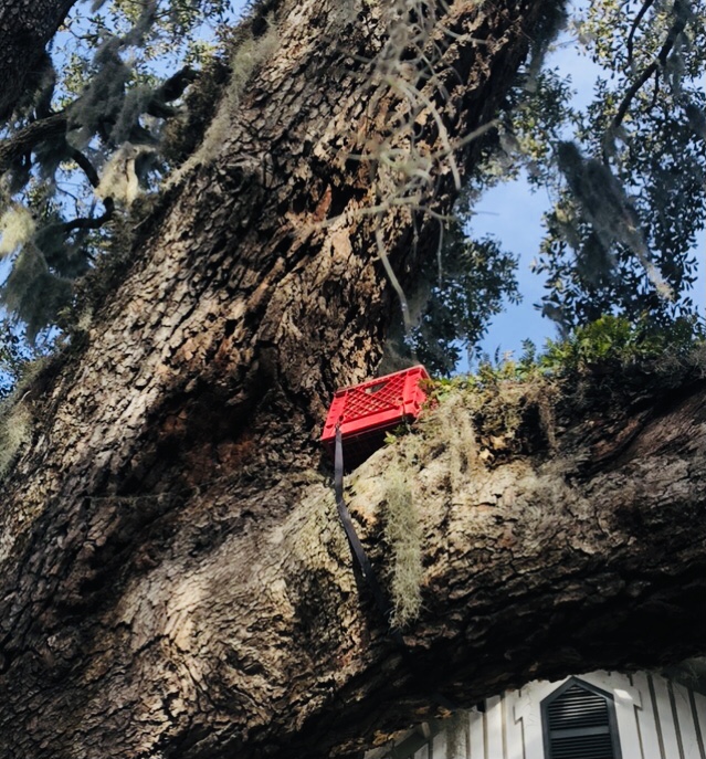 People jogging by, slow to wonder about the odd milk crate strapped to the big oak tree. They shake their heads and run on by.