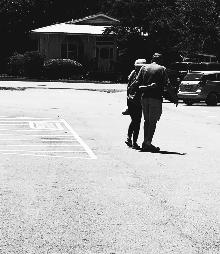 Now it is she who steadies and stabilizes him; steers him to the car.