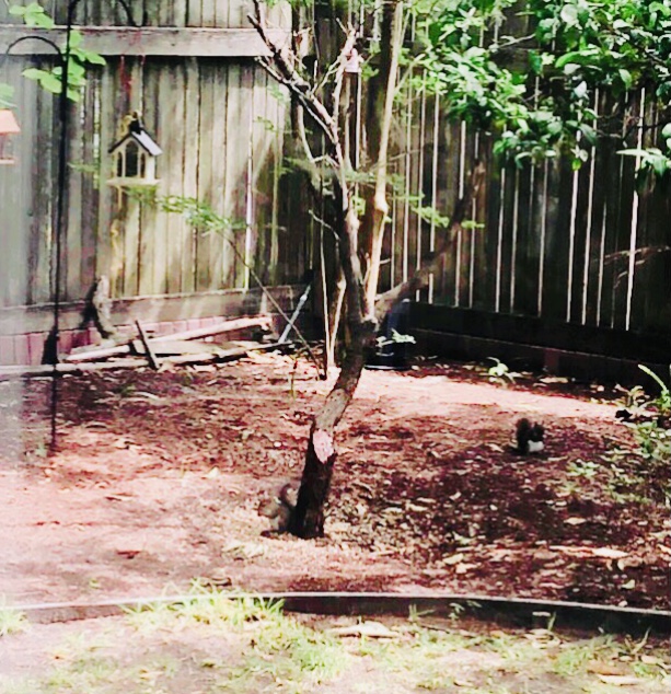Confused and baffled that the bird feeder, which hung from one of the barren branches only yesterday, is no longer where they remember it being.